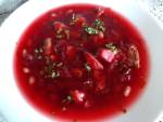 Barszcz czerwony z ziemniakami i ciecierzycą 116Trochę inna, uboższa wersja barszczu ukraińskiego. Też smaczna. Ja w sumie zupy z burakami mogę jeść pod każdą postacią, lubię i już. Dla mnie połączenie buraków