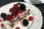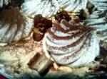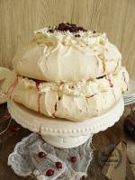 Beza straciatella z wiśniami 262Beza, krucha z zewnątrz, piankowa w środku i bita śmietana połączona z czekoladą karmelową i gorzką, całość zwieńczona konfiturą z wiśniami…bomba kaloryczna to fakt, prawdziwa