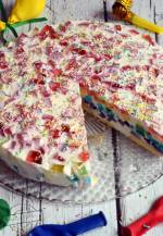 Śmietanowiec z galaretką 3312Taki deser pewnie większość dorosłych osób pamięta ze swojego dzieciństwa. Ja w każdym bądź razie pamiętam. To niebywałe, że pewne dania/ciasta/desery nie tracą z biegiem lat
