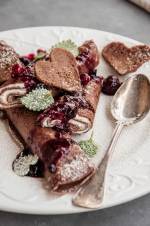 Czekoladowe naleśniki z sosem z owoców leśnych  SKŁADNIKI: Ciasto: mąka orkiszowa 1 szklanka woda gazowana  1 szklanka mleko / napój migdałowy  1/2 szklanki