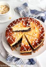 galaretką wiśniową. Wierzch ciasta to herbatniki również nasączone ponczem kawowym z procentami oraz czekoladowe ganache, które pełni rolę polewy. Aż 8 pysznych warstw! Połączenie tak różnorodnych składników sprawia, że ciasto jest bardzo ciekawe i niebanalne, a z każdym kęsem odkrywa się nowe smaki. Delikatny biszkopt kakaowy, bardzo kremowa, waniliowa masa budyniowa, chrupiące warstwy - z wiórków kokosowych oraz orzechów włoskich(...)łyżeczka proszku do pieczenia 3 łyżki oleju rzepakowego szczypta soli Beza orzechowa: 3 białka ok. 3/4 szklanki drobnego cukru 150 g włoskich orzechów Beza kokosowa: 3 białka ok. 3/4 szklanki cukru 150 g wiórków kokosowych Masa budyniowa: 2 szklanki mleka 4 żółtka trochę ponad 1/2 szklanki cukru 1 op. cukru z wanilią 2 łyżki mąki pszennej 2 łyżki mąki ziemniaczanej