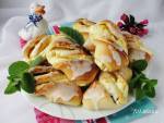 Drożdżówki z serem i rodzynkami 280jajko 2 łyżki cukru waniliowego 1 garść rodzynek 1 łyżeczka skórki z pomarańczy (świeża) Przygotowanie: Nadzienie: twaróg rozgnieść widelcem dodać jajko, cukier rodzynki i wymieszać. Zaczyn: mleko podgrzać dodać pokruszone drożdże, cukier i wymieszać. Pozostawić na około 10 minut aż drożdże "ruszą". Ciasto: do misy miksera przesiać mąką, wbić jajko dodać sól, cukru, zaczyn drożdżowy i letnie rozpuszczone masło. Mikserem(...)ciepłe miejsce do podwojenia objętości. Wyrośnięte ciasto przełożyć na lekko oprószoną mąką stolnicę i rozwałkować ciasto na prostokąt o wymiarach około 60*30 cm. Na cieście równomiernie rozsmarować twaróg. Ciasto z dłuższej strony złożyć ponad połowę i przykryć resztą ciasta. Uzyskany prostokąt z nadzieniem pokroić na 12 równych części. Każdy mały prostokąt skręcić w połowie i ułożyć na blasze wyłożonej
