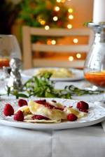 Pierogi z twarogiem, ricottą i rodzynkami z musem malinowym 265Wigilijne! Trochę na podobiznę oryginalnego przepisu powstał ten, moim zdaniem bardzo smaczny, z dodatkiem ricotty i wielu przepysznych dodatków! Składniki (na 30-40 pierogów): ciasto należy przygotować z tego przepisu 200 gram twarogu chudego 200 gram ricotty 100 gram rodzynek, namoczonych przez noc w gorącej wodzie (lub whisky, rumie albo Amaretto jeśli pierogów nie będą jadły dzieci(...)maliny świeże do podania (lub mrożone, tak jak na zdjęciu) 300 gram mrożonych malin + 150 ml wody na mus malinowy jogurt naturalny do podania Z podanego przepisu należy przygotować ciasto. Twaróg przepuszczam przez praskę dwukrotnie, mieszam z ricottą, jajkiem, drobno posiekanymi (i odcedzonymi z płynu) rodzynkami, skórką pomarańczy, Amaretto, jajkiem, cukrem pudrem i ziarenkami wanilii. Ciasto na pierogi wałkuję cienko