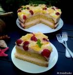 hawajka 256cięższy ale bardziej wilgotny. P.S. jeśli nie próbowaliście jeszcze ciasta z kokosem zalanym galaretką, to polecam. Taki "napity" kokos jest pyszny. *tortownica 21 cm: na biszkopt Królowej Wiktorii: 4 jajka 225 g mąki 225 g cukru 225 g masła 1,5 łyżeczki proszku do pieczenia na masę serową: 250 g twarogu półtłustego 200 ml śmietanki kremówki 2 łyżki cukru pudru(...)marakuja) Miękkie masło utrzeć na puch najpierw samo a następnie z cukrem. Kiedy masa będzie puszysta dodawać po żółtku a na końcu mąkę wymieszaną z proszkiem do pieczenia. Ciasto przełożyć do tortownicy (można upiec w dwóch osobnych) i wstawić do piekarnika nagrzanego do 180*C na około 50 minut. Upieczone ciasto porządnie wystudzić, ściąć mocno wyrośnięty wierzch a całość podzielić