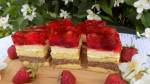 Sernik gotowany z truskawkami 281biszkopt: 6 jajek 1 szkl. cukru 1 szkl. mąki tortowej 1/2 szkl. mączki ziemniaczanej 1 łyżka proszku do pieczenia Mąkę tortową,mączkę ziemniaczaną i