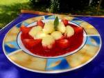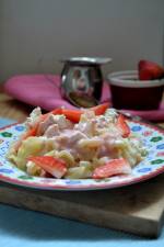 Makaron z truskawkami i twarogiem 274Piekę z nimi drożdżówki, ciasto, robię koktajle, ale również wykorzystuję do obiadu, gdy nie mam czasu na długie stanie przy garnkach, albo gotowanie się w kuchni. W dni kiedy wolę iść na spacer, albo za oknem jest plucha, a ja chcę wnieść trochę lata do domu. W takie dni przygotowuję makaron z truskawkami i twarogiem. Jak dla mnie danie bardzo