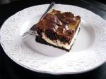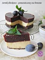 Sernik śliwkowo-pomarańczowy na brownie 280Obłędnie czekoladowe brownie, pomarańczowy sernik i słodko kwaśny mus śliwkowy z pomarańczą. A to wszystko w jednym kawałku ciasta! Tortownica 20 cm Brownie: 60 g masła