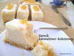 Sernik karmelowo-kokosowy. 292kostkę i miksujemy, aż otrzymamy ciasto o konsystencji sypkiej kruszonki, następnie dodajemy jajko i żółtko i znów miksujemy, do chwili aż otrzymamy zwartą kruszonkę. Formę wykładamy papierem do pieczenia, wysypujemy kruszonkę i dokładnie dociskamy grzbietem łyżki lub dłonią, lub wałkujemy małym wałeczkiem (ważne by zrobić to naprawdę dokładnie). Odkładamy. MASA SEROWA: 1 kg twarogu dwukrotnie zmielonego 3 jajka 1 białko(...)Wyrównujemy łyżką i wkładamy do nagrzanego do 175 stopni C piekarnika i pieczemy około 50 minut. Po tym czasie wyłączamy grzanie i uchylamy drzwiczki piekarnika. Po 15 minutach wyjmujemy ciasto z piekarnika i studzimy. LUKIER: 200 g cukru pudru 2-3 łyżki wody lub soku z cytryny Cukier puder przesiewamy, dodajemy kolejno 1 łyżkę wody, za każdym