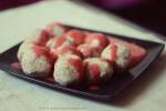serowe knedle z truskawkami - razowe i bez jajek! 244mąki razowej, ale jeśli nie przepadacie za wyczuwalnymi otrębami w cieście (chociaż lepsze to niż grudki ziemniaków... :P) dajcie pół na pół mąkę pszenną zwykłą i razową. A jajko...A jajka nie ma, bo zapomniałam. SEROWE KNEDLE Z TRUSKAWKAMI - RAZOWE I BEZ JAJEK przepis autorski // 12 knedli ~250g mielonego twarogu (taki jak na sernik, może być 'wiaderkowy') ~90g mąki pszennej