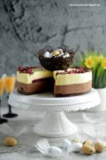 Czekoladowy sernik na zimno z musem ajerkoniakowym i malinami 145Deser, który wykonałam jakiś czas temu w ramach pewnego konkursu. Konkursu wielkanocnego, dodam, stąd taka dekoracja. Konkursu nie wygrałam, ale pozostał przepis na fantastyczny serniczek