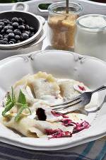Tradycyjne pierogi z jagodami 221Tradycyjne pierogi z jagodami ze śmietaną i cukrem to wspomnienie dzieciństwa. Każde dziecko na naszym osiedlu musiało mieć w lecie jagodowy język, którym się potem chwaliło
