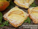 ciastka francuskie z gruszką i serem 263współgra też z ciastem francuskim. Takie ciastka można też zabrać ze sobą na wycieczkę czy do szkoły jako zamiennik tradycyjnych drożdżówek. Składniki na 6 sztuk: arkusz ciasta francuskiego 200 g twarogu półtłustego 2 jajka 2 łyżki cukru pudru + do posypania 2 gruszki szczypta cynamonu Twaróg wymieszać z jajkiem, cukrem pudrem i cynamonem. Gruszki pokroić na ćwiartki, usunąć gniazda nasienne