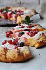 Galette z serem i truskawkami 365przygotowałam Gilette na słodko, jako nadzienie wykorzystałam twaróg z kostki (ale ser z wiaderka też może być), budyń truskawkowy (który nadał masie twarogowej delikatnie różowego koloru) i świeże, słodkie, pachnące, pyszne truskawki, które teraz królują na polskich stołach. Moja Galette z serem i truskawkami bazuje na łatwym w przygotowaniu kruchym kukurydzianym cieście, w którym funkcję spajającą pełni gęsta, kwaśna śmietana(...)Przygotowanie: Z mąki kukurydzianej, masła, śmietany i cukru pudru wyrabiamy jednolite ciasto, ja wyrabiałem je mechanicznie hakiem robota.. Ciasto formujemy w kulę, zawijamy w folię spożywczą i wkładamy do lodówki na 30 minut. W międzyczasie przygotowujemy farsz miksując twaróg z cukrem, potem dodajemy suchy budyń, jajko, wlewamy olej i mleko, miksujemy aż wszystkie składniki utworzą gładką masę. Schłodzone ciasto