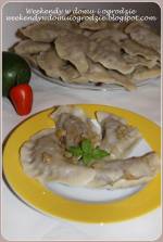 Pierogi z kaszą gryczaną i twarogiem 276średnicy użytego wykrawacza): Farsz 250 ml kaszy gryczanej 3 liście laurowe 4 ziarna ziela angielskiego cebula łyżka oleju do smażenia 2 czubate łyżki zmielonego twarogu jajko pieprz i sól do smaku Ciasto pół kg mąki pszennej (u mnie typ 480) i kilka łyżek do podsypywania podczas wałkowania ok. 280 ml wrzątku łyżeczka soli Kaszę wypłukać i ugotować na miękko(...)potem wyrabiać ręką na gładkie i elastyczne ciasto. Odstawić pod przykryciem, by nieco odpoczęło. W tym czasie dodać do kaszy jajko i zmielony twaróg. Dobrze wymieszać i doprawić całość do smaku solą i pieprzem. Ciasto podzielić na 4 części. Każdą rozwałkować na cienki (2 mm) placek na blacie oprószonym mąką. Nie należy sypać zbyt dużo mąki, bo pierogi nie będą