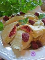 Pierogi z twarogiem, kaszą manną i malinami 207smak i zapach… Uwielbiam maliny a w połączeniu z twarogiem i kaszą manną wyszły zjawiskowe… Ciasto: 500 g mąki pszennej 1 żółtko 1 łyżeczka masła 200 ml ciepłej wody Odrobina soli Farsz: 250 g chudego twarogu 1 łyżka śmietany 18% (gęstej) 10 g cukru waniliowego 2 łyżki kaszy manny 2 łyżki cukru 1 żółtko Ok. 100 g malin Ciasto(...)miski przesiewamy mąkę. Robimy dołeczek i dodajemy żółtko i masło. Mieszamy. Stopniowo dolewamy wodę i zagniatamy ciasto na gładką masę. Odstawiamy na 10 minut. Po tym czasie rozwałkowujemy na dość cienki placek. Wycinamy kółka. Farsz: W miseczce mieszamy dokładnie twaróg, kaszę manną, cukry i żółtko. Każde koło napełniamy 1 łyżeczką farszu i układamy 2 maliny. Zlepiamy brzegi. Pierogi wrzucamy
