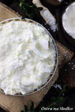 PRINCESSA KOKOSOWA – BISZKOPT KOKOSOWY Z KREMEM PRINCESSA 919mąkę przesianą z proszkiem do pieczenia i delikatnie mieszamy. Ciasto wylewamy na tortownicę wyłożoną na dnie papierem do pieczenia. Pieczemy ok. 30 minut / 180C ( do suchego patyczka ), k roimy na 2 blaty. KREM KOKOSOWY: Żelatynę rozpuszczamy w niewielką ilością zimnej wody, odstawiamy do napęcznienia, podgrzewamy do rozpuszczenia i studzimy. Twaróg ucieramy z cukrem, a następnie dolewamy lekko przestudzoną żelatynę. Dodajemy