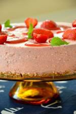 Lekki sernik na zimno z truskawkami 309mielę lub przeciskam przez praskę 3 lub 4 razy. Twaróg mieszam z chłodną masą truskawką. Dodajemy również pozostałe 100 gram pokrojonych truskawek. Ciasteczka miksuję z masłem i przekładam na dno tortownicy wyłożonej papierem do pieczenia (papier wypuszczamy na zewnątrz tortownicy). Spód ugniatamy. Następnie wlewamy masę serowo-truskawkową i wstawiamy ciasto do lodówki na minimum 3 godziny- najlepiej na całą