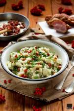 Ziemniaczane kluchy mojej babci (szare kluski) 184porcji 2 kg ziemniaków o wysokiej zawartości skrobi ok. 2 szklanek mąki pszennej 2 duże wiejskie jajka 2 płaskie łyżeczki soli boczek wędzony, ilość wg uznania półtłusty twaróg, ilość wg uznania natka pietruszki, opcjonalnie * PRZYGOTOWANIE Ziemniaki należy obrać i umyć, a następnie zetrzeć na tartce o drobnych oczkach (jak na placki ziemniaczane). Tę czynność można sobie ułatwić np. malakserem. Masę(...)wsypujemy mąkę oraz sól. Wodę po ziemniakach odlewamy, zostawiając skrobię, która zebrała się na dnie garnka. Wybieramy ją i dodajemy do ziemniaków. Masę ziemniaczaną dokładnie mieszamy. Powinna przypominać konsystencją ciasto na lane kluski. Jeśli wydaje nam się za rzadka, to dosypujemy więcej mąki. Jeśli jest za gęsta, to możemy zetrzeć jeszcze jednego ziemniaka. W dużym garnku gotujemy wodę wraz