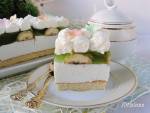 Sernik bananowo agrestowy 316Lekkie, delikatnie orzeźwiające ciasto z dodatkiem bananów. Pomijając biszkopt to można by powiedzieć, że to sernik bez pieczenia. Jeśli nie chcemy piec biszkoptu, można na spód dać biszkopty lub zrobić spód z herbatników. Składniki: Biszkopt: 4 jajka 4 łyżki mąki pszennej 4 łyżki cukru sól szczypta 1 łyżeczka proszku do pieczenia Masa serowa: 1 kg twarogu z wiaderka 1 szkl(...)Zimną kremówkę ubić na sztywno z cukrem pudrem. Wlewać rozpuszczoną letnią żelatynę i chwilkę miksować. Bitą śmietanę przełożyć do worka cukierniczego z okrągłą końcówką i zrobić na całej powierzchni ciasta "kleksy". Przed podaniem udekorować prymulkami z opłatka. Do przygotowania ciasta polecam użyć blaszki z wysokimi rantami