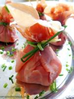 Sakiewki z szynki serrano 471Prosta i bardzo smaczna przekąska z szynki serrano z serkiem śmietankowym, świeżą bazylią i pomidorkami truskawkowymi. Przygotowanie takich sakiewek nie zajmuje wiele czasu, ładnie prezentują się