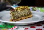 Sernik pistacjowy z polewą z białej czekolady 226składników zagniatamy ciasto. Wyklejamy nim formę. Chłodzimy przez 30 minut w lodówce. Pieczemy w piekarniku rozgrzanym do 180 stopni do momentu lekkiego zarumienienia. Składniki na masę serową: - 300 gramów niesolonych orzeszków pistacjowych (waga bez łupinek) - 400 gramów mleka słodzonego skondensowanego - 2 łyżeczki wody różanej lub ekstraktu z wanilii - 2 jajka - 250 gramów serka mascarpone - 250 gramów twarogu tłustego lub półtłustego