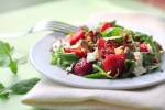 Dietetyczna Sałatka ze świeżych truskawek i sera. Prosty przepis kulinarny jak wykorzystać świeże truskawki. 327Sezon na truskawki powoli zbliża się ku końcowi. Domyślam się, że część z Was już skorzystała z przepisu na pyszne ciasto truskawkowe ( tutaj ). Spora ilość truskawek jest u nas podawana w formie takiego śniadania/kolacji czy deseru: truskawki na śniegu ( tutaj ). Jeśli jednak szukasz pomysłu na danie ze świeżymi truskawkami w formie nieco mniej słodkiej(...)Tutaj . Składniki na 6 porcji sałatki: 1 średnia sałata, sok z 1/2 cytryny, sól himalajska, 1 łyżeczka oliwy z oliwek, 15 dag twarogu koziego (może być inny ser), 1 pęczek szczypiorku, 1 ząbek czosnku, 1 łyżeczka nasion czarnuszki ( sprawdź tutaj ), 20 dag świeżych truskawek. Opłukaną sałatę osuszyć