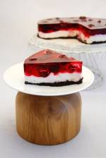 Sernik na zimno z wiśniami i galaretką 210Składniki (na tortownicę o średnicy 21 cm) : Spód: 150 g ciastek Oreo 40 g masła Ciasteczka pokruszyć, ja to robię w moździerzu. Masło roztopić, połączyć dokładnie