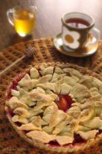 Tarta z nektarynkami 215połowy porcji/Ciasto; 100 g zimnego masła, sól, 15 dkg cukru, 150 g mąki, Nadzienie; 150 g dojrzałych nektarynek, 2 łyżeczki miodu akacjowego, 100 g mielonego twarogu, otarta skórka z 1/4 cytryny, Wykonanie;Zagniatamy ciasto i schładzamy przez godzinę w lodówce.Z nektarynek usuwamy pestki i dzielimy na cząstki. Skrapiamy je sokiem z cytryny. Twaróg mieszamy z miodem. Jeżeli robisz