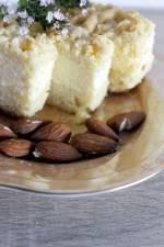 Sernik z brzoskwiniami 239bezy)Ser:3 jajka1 szkl cukru125 g miękkiego masła lub margaryny (u mnie Kasia)1 kg twarogu sernikowego (u mnie President) lub innego trzykrotnie zmielonego 1 opakowanie budyniu śmietankowegoPonadto:1 puszka brzoskwiń5 białek3/4 szkl cukru1 łyżka mąki ziemniaczanej 1. Z podanych składników zagnieść ciasto kruche. 2. Blachę wyłożyć papierem do pieczenia, wyłożyć cienką warstwę ciasta (ja nie cierpię wałkować(...)godziny). Uwaga: na tartce można zetrzeć również spód ciasta. 2. Ser: Całe jajka utrzeć z cukrem, dodać masło, mąkę i twaróg porcjami, dalej ucierając (aż do dokładnego połączenia).3. Na ciasto w blaszce (nie podpieczone) wylać masę serową. Na to wyłożyć pokrojone w kosteczkę lub paseczki brzoskwinie.4. Białka ubić na sztywno, dodać cukier i mąkę ziemniaczaną i jeszcze chwilę