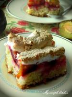 Ciasto ze śliwkami z bezą na serowym spodzie i... 1 urodziny bloga:):) 230Blaszka o wymiarach 26/41 cm Składniki: 1 kg śliwek węgierek 1 jajko 7-8 łyżek mleka 7-8 łyżek oleju 20-25 dag chudego twarogu (kostka) 40 dag cukru (25 dag do ciasta, 15 dag do bezy) szczypta soli 1 torebka cukru waniliowego 40 dag mąki 2 kopiaste łyżeczki proszku do pieczenia 1-2 łyżki bułki tartej 4 białka(...)soku z cytryny cukier puder Śliwki umyć, wydrylować, pokroić na połówki lub ćwiartki. Jajko zmiksować z twarogiem, mlekiem, cukrem i olejem. Dodać szczyptę soli i cukier waniliowy. Mąkę wymieszać z proszkiem do pieczenia i stopniowo dodawać do masy. Całość wyrobić na gładkie ciasto. Blaszkę dobrze natłuścić. Wyłożyć do niej ciasto i równomiernie je rozwałkować. Posypać tartą bułką i wyłożyć