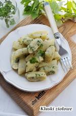 Kluski ziołowe 275Kluski ziołowe to kluski z twarogu, jajka, mąki i mieszanki świeżych ziół, ugotowane w lekko osolonej wodzie. Kluski są pyszne, pachnące świeżymi ziołami, zostały polane tylko