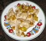 ruskie pierogi z żytniej mąki... 262Składniki: CIASTO ŻYTNIE: mąka żytnia z Kopytowa 3 szklanki, mąka pszenna 500 z Kopytowa 2 szklanki, śmietana gęsta 2 łyżki, masło 1 łyżeczka, sól 1 łyżeczka, woda 1,5 szklankiFARSZ RUSKI: ziemniaki gotowane w mundurkach 1 kg, twaróg 25 dag, cebula podsmażona 5 sztuk, olej rzepakowy 2 łyżki, pieprz czarny mielony 3/4 łyżeczki, sól wędzona Royal Brand 1 łyżeczkaOKRASA: cebula(...)mąką i jeszcze ręcznie wyrobić na gładka kulę, schować do woreczka na 30 minut ugotowane i obrane ziemniaki zemleć w maszynce razem z twarogiem i dobrze wymieszać z podsmażoną wystudzoną cebulą, pieprzem i solą wędzoną z ciasta w woreczku odkroić porcję i rozwałkować na obsypanej mąką stolnicy na cienkie ciasto - wycinać placki szklanką z większym otworem i nakładać odpowiednią porcję