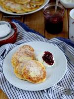 Syrniki - rosyjskie placki twarogowe 308nasze pierogi leniwe, jednak nie ubija się białek, co znacznie przyspiesza całość przygotowania. Sekretem dobrych syrniczków jest prawdziwy twaróg. Nie nadają się tutaj rzadkie wiaderkowe sery. Swoją delikatność placki zawdzięczają niewielkiej ilości mąki. Do ciasta na placki trzeba jej dodać tyle, żeby wszystko razem się połączyło i dało uformować w wałek. Składniki: 500 g twarogu 2 jaja (dałam(...)plus trochę do podsypania 2 łyżki cukru waniliowego do podania do wyboru: cukier puder, śmietana, konfitura, dżem, ulubione owoce Twaróg dobrze rozgnieść widelcem (bardziej ambitni mogą przecisnąć przez praskę). Dodać jajka, mąkę, cukier. Dobrze wymieszać. Na posypanej mąką stolnicy wyrobić ciasto (dość krótko). Uformować wałki i pociąć na plastry. Każdy placek obtoczyć w mące, poprawić jego kształt. Na patelni rozgrzać