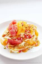 Naleśniki. Woda różana, granat i cytrusy. 256mleka, 30 g śmietanki kremówki, 2 łyżki oleju rzepakowego 1 pomarańcza, 1 grejpfrut, 1 łyżka cukru, 1 łyżeczka wody różanej, szczypta kardamonu, pistacje, granat twaróg, śmietanka, cukier Wszystkie składniki naleśników wymieszać ze sobą w misce, ciasto musi być bardzo płynne i gładkie, bez grudek. Naleśniki smażyć na nieprzywieralnej patelni do ładnego zrumienienia. Twaróg połączyć ze śmietanką i dosłodzić do smaku