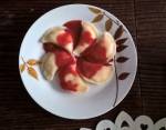 Pierogi na słodko z białym serem i kaszą jaglaną podane z sosem truskawkowym 344rodzynek też zrobił swoje (tak, w środku są rodzynki :)). Smacznego! Składniki na ok 42 pierogów: domowy sos truskawkowy Ciasto: 2 szklanki mąki pszennej typ 450 lub 650 3/4 szklanki gorącej przegotowanej wody 3 łyżki oleju szczypta soli Nadzienie: ok 400 g twarogu półtłustego (mój miał 386 g) 6-7 łyżek ugotowanej kaszy jaglanej 2 żółtka 3,5 łyżki cukru(...)szybciej. Zuzia spała, więc nie chciałam aż tak hałasować. Ręcznie poszło fajnie. Z żółtek powstanie jasna, puszysta masa. Dodaj twaróg i utrzyj do gładkości. Dodaj kaszę jaglaną i rodzynki. Wymieszaj dokładnie. Sprawdź, czy jest dostatecznie słodkie. Możesz ewentualnie dosłodzić. Ciasto podziel na 2-3 części. Każdą rozwałkuj cienko na stolnicy lub blacie podsypanym odrobiną mąki. Szklanką wykrój krążki. Ja użyłam