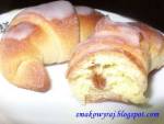 Rogaliki drożdżowe z nadzieniem sernikowym, czyli z twarożkiem i rodzynkami :) 240Ciasto: 5 szklanek mąki (+1 do podsypania) 2/3 szklanki cukru 1 cukier waniliowy 5 dag drożdży (+1 łyżeczka cukru) 2 łyżki oliwy 1 ½ szklanki mleka 1 jajko 1 żółtko Masa serowa: ½ kg twarogu (tłustego lub półtłustego) ½ szklanki cukru 1 duże opakowanie cukru waniliowego 3 żółtka 1 łyżka budyniu waniliowego lub śmietankowego (proszku) Kilka kropli aromatu cytrynowego lub pomarańczowego 1/3 szklanki(...)waniliowy, jajko, żółtko i na koniec wyrośnięte drożdże. Całość wyrabiamy na jednolitą masę ręką lub widelcem(ja na początek zawsze używam widelca :) Ciasto pozostawiamy do wyrośnięcia. Teraz jest pora na przyrządzenie nadzienia, a więc masy sernikowej :) Twaróg miksujemy z cukrem, cukrem waniliowym, żółtkami, proszkiem budyniowym i aromatem. Rodzynki parzymy przez sito ciepłą wodą, a następnie przesypujemy mąką i dodajemy