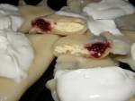 pierogi z twarogiem i wiśniami 233Składniki: farsz 500 gram twarogu 1 żółtko cukier ćwiartkowy słoik drylowanych wiśni ciasto 2,5 szklanki mąki ciepła woda oliwa dodatkowo: śmietana Sposób wykonania: Twarożek zmieliłam , dodałam żółtko, cukier ( do smaku ), wymieszałam na jednolita masę. Mąkę przesiałam , dodałam ciepłą wodę, odrobinę oliwy. Zagniotłam na gładkie elastyczne ciasto. Ciasto rozwałkowałam dość cienko, wykroiłam krążki szklaneczką. Na każdy krążek nałożyłam farsz twarogowy