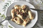 PIEROGI RUSKIE 293środku dołek, wlać olej, wsypać sól i wlewać wodę jednocześnie wyrabiając ciasto. Wyrabiać do momentu, aż ciasto będzie miękkie i elastyczne. Ciasto przykryć ściereczką kuchenną na ok. 15-20 minut. farsz: Ugotowane ziemniaki przecisnąć przez praskę. Dodać twaróg oraz pokrojoną w kostkę i zeszkloną cebulę. Wyrobić farsz i przyprawić solą oraz pieprzem do smaku. Ciasto rozwałkować na stolnicy. Wykrawać krążki