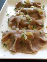 Pierogi z kaszą gryczaną i białym serem 233zeszklona cebulka. Polecam, bo naprawdę pyszne :)) Składniki ciasto: 500 g maki pszennej 1 żółtko ok 2 łyżki oleju woda (mocno ciepła) tyle ile zabierze ciasto sól Farsz: woreczek kaszy gryczanej (wcześniej ugotowanej) 250 g twarogu 3 większe cebule sól zioła pieprz masło klarowne Kaszę gotujemy według przepisu na opakowaniu. Cebule kroimy w drobna kosteczkę, musimy ją zeszklić na masełku. Gotową