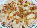 Pierogi ruskie 403danie z niewyszukanych składników. Zapisz przepis Drukuj Składniki (dla 2 osób / ok. 20 pierogów) 2 średnie ziemniaki (300g) 150g tłustego twarogu 1 mała cebula (100g) 1 łyżeczka soli 1/2 łyżeczki czarnego pieprzu świeżo mielonego 2 łyżki oleju rzepakowego ciasto na pierogi gotowane wg naszego przepisu Dressing 150g wędzonego boczku 1 mała cebula (100g) Instrukcje Ziemniaki obieramy i gotujemy do miękkości(...)rozgrzewamy 2 łyżki oleju i wrzucamy cebulę. Podsmażamy do zeszklenia ok. 3 minuty. Twaróg (najlepiej ogrzany w temperaturze pokojowej) rozgniatamy widelcem. Dodajemy pozostałe składniki: ziemniaki, cebulę razem z olejem, a także sól i pieprz. Wyrabiamy wszystko na jednolitą gładką masę. Pierogi lepimy w sposób i z ciasta wg naszego przepisu . Uformowane wrzucamy (najlepiej partiami po ok. 10 sztuk) do dużej