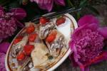 Naleśniki łaciate pod pachnącą piwonią 216mąki pszennej sól 1 łyżka kakao olej Nadzienie 200 gram twarogu 2 banany z grilla 2 łyżki soku z cytryny 1 cukier wanilinowy 2 łyżki miodu 1 mała śmietana kwaśna 18% Wykonanie: Mleko przelewamy do miski dodajemy jajka, mąkę oraz szczyptę soli miksujemy dokładnie aby ciasto było bez grudek, połowę ciasta przelewamy do drugiej miski dodajemy kakao. Rozgrzewamy patelnie, smarujemy(...)okrąg, następnie obok ciasta białego dodajemy ciasto kakaowe również robiąc okrąg i tak na przemian wlewamy ciasto aż będziemy mieli cały placek naleśnikowy. W ten sposób smażymy wszystkie naleśniki. Banany grillujemy ze skórką, studzimy, obieramy, przekładamy do miseczki, widelcem rozdrabniamy. Do bananów dodajemy twaróg oraz pozostałe składniki nadzienia, wszystko widelcem dokładnie mieszamy rozdrabniając. Na usmażone naleśniki rozsmarowujemy nadzienie, zwijamy
