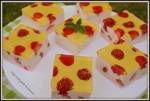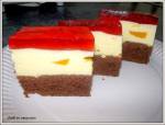 CIASTO Z BRZOSKWINIOWĄ PIANKĄ. 258szklanki mąki, 1 czubata łyżka kakao. PIANKA: 2 śnieżki, 1 i 1/2 szklanki mleka, 50dag serka Philadelphia (można zastąpić zmielonym twarogiem), 2 galaretki brzoskwiniowe, 1 puszka brzoskwiń. Na wierzch 2 galaretki truskawkowe rozpuszczone w 750ml wody. WYKONANIE: CIASTO: Dno blaszki o wymiarach 23x34cm wyłożyć papierem do pieczenia. Piekarnik rozgrzać do 180'C. Mąkę przesiać z sodą, proszkiem do pieczenia