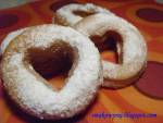 Oponki, krążki, pączki serowe 201Smalec do smażenia Cukier puder do posypania Mąkę i cukier wsypujemy do miski, robimy w nich dołek, do którego wbijamy jajko, dodajemy twaróg, olej, mleko i proszek do pieczenia. Całość razem mieszamy widelcem lub szpatułką. Wyrobione ciasto wałkujemy, a następnie wycinamy z niego, przy pomocy szklanki i kieliszka oponki. Ja zamiast kieliszka użyłam foremki serduszka. Wycięte oponki wrzucamy na gorący