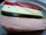 sernik w 4 kolorach na zimno 248koniec ubijania dodaj jedną łyżeczkę soli. Żółtka utrzyj z 4 łyżkami cukru pudru, dodaj ziarenka z laski wanilii i resztę twarogu, a na koniec ostudzoną żelatynę. Wymieszaj dokładnie i wylej na galaretkę agrestową , przykryj ciasto folią i schowaj ponownie na około 30 minut. Przygotuj galaretkę czerwoną. 1 i 1/2 galaretki rozpuść w półtorej szklanki wody. Ostatni etap