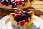 Ciasto z owocami, czy owoce z ciastem? 249tylko upiec płaski placek. Serowy spód ma ciekawy smak. Do tego krem budyniowy, który oddziela ciasto od solidnej warstwy owoców. To chyba mój słodki faworyt tego sezonu. Ciasto 200 g trzykrotnie zmielonego twarogu 6-8 łyżek oleju 6-8 łyżek mleka 6 łyżek cukru 2 szklanki mąki pszennej 2 łyżeczki proszku do pieczenia dodatkowo masło do posmarowania blachy Twaróg utrzeć(...)mlekiem, olejem i cukrem. Mąkę przesiać z proszkiem do pieczenia. Dodać do twarogu i wyrobić gładkie, miękkie ciasto. Blachę (25 X 40cm) wysmarować masłem i wylepić ciastem. Piec 20 minut w 200°C. Wyjąć, odstawić do ostudzenia. Masa budyniowa 1,5 szklanki mleka 3/4 szklanki mąki pszennej 3 jaja 1/2 szklanki cukru 1 opakowanie cukru waniliowego (8g) 100 g miękkiego