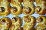 Lussekatter - szwedzkie bułki szafranowe 261literę „S”. Z ciasta toczy się wałek, następnie każdy koniec zwija się w przeciwną stronę aż do środka wałka. W środek każdego zwinięcia można wcisnąć rodzynkę. Jeśli nałoży się jedno takie lussekatte na drugie powstaje „gullvagn”. Można też uformować „julkors”, „lindebarn”, „kyrkporten”, „prästens”, „hår”, „såkaka” i wiele innych wzorów: Bułki te są wyjątkowo delikatne i puszyste, twaróg dodaje aksamitności(...)patelni roztop masło. Do dużej miski wlej mleko z szafranem, dodaj resztę cukru (70 g), sól, rozdrobniony twaróg, roztarte drożdże z cukrem i odrobiną mleka oraz makę. Dokładnie wymieszaj składniki. Warto użyć mocnego miksera lub robota, aby dobrze wyrobić ciasto, a zwłaszcza dobrze roztrzeć tawróg. Ciasto należy wyrabiać dopóty, dopóki nie zacznie odklejać się od ścianek miski. Wtedy dodaj roztopione