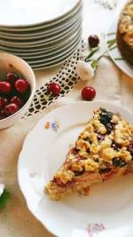 Jaglane ciasto z waniliowym twarożkiem i czereśniami 342wypiekom. Serdecznie polecam!~ Składniki (na tortownicę o śr. 23 cm) : Ciasto : 200 g kaszy jaglanej + szklanka mleka + szklanka wody 100 g mąki krupczatki 100 g masła 100 g cukru 3 jajka 2 łyżeczki proszku do pieczenia pół szklanki mleka Waniliowy twarożek : 200 g twarogu półtłustego w kostce ok. 12 ptasich mleczek waniliowych jajko łyżka skrobi/budyniu(...)konieczne, ale mi zależało na samej piance), następnie roztopić w kąpieli wodnej lub mikrofalówce. Twaróg utrzeć z jajkiem, cukrem, jogurtem i budyniem. Na koniec wmieszać w to ptasie mleczko. W misce rozetrzeć masło (pokrojone na kawałki) z mąką, cukrem i muesli, do czasu powstania kruszonki. Ciasto wyłożyć do natłuszczonej i oprószonej kaszą manną/bułką tartą tortownicy. Na to nałożyć