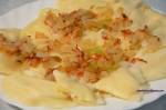 Kluski kładzione po lubelsku 287szkl mąki 1 jajko sól woda słonina 1 cebulka biały ser, twaróg natka pietruszki Mąkę wsypać do miski, wbić jajko, posolić, dolać stopniowo wodę, i łyżką mieszać ciasto by było gęste, kleiste ale nie płynne. W garnku zagotować wodę , osolić, łyżkę zmoczyć w gorącej wodzie i nabierać małe kluski, po czym natychmiast wkładać je do wody. Ugotowane odcedzić. Na patelni