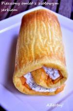 Pieczony omlet z ziołowym serkiem 283Dzięki przetworom z mleka dostarczam oranizmowi witaminy i sole mineralne oraz dbam o florę jelitową." 8 jajek 3 łyżki mleka łyżeczka soli 2 łyżki mąki ziemniaczanej/ lub pszennej twaróg naturalny 350 gram łyżka siemienia lnianego koperek natka pietruszki rzodkiewka stara na dużych oczkach Żółtka oddziel od białek. Białka ubij mikserem na sztywno z solą . Żółtka ubij w drugiej misie(...)wolnych obrotach. Wysmaruj papier do pieczenia masłem. Weź dużą blachę i wyłóż ją papierem posmarowanym masłem. Wylej ciasto do formy i równomiernie rozsmaruj. Piecz w 200 stopniach 10-15 minut. Pozostaw do lekkiego wystygnięcia. Oderwij papier z omletu, rozprowadź twaróg wymieszany z ziołami, rzodkiewką i siemieniem lnianym. Zroluj. Gotowy omlet pokój w plastry