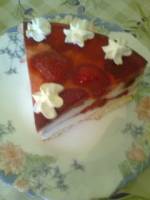 Sernik z truskawkami 268paczka biszkoptów 500g truskawek 250 g śmietany słodkiej 30% 500g twarogu sernikowego śmietan-fix 2,5 łyżki żelatyny galaretka truskawkowa 50 g cukru Tortownice wyłożyć biszkoptami, truskawki oczyścić i opłukać. Galaretke rozpuścić w gorącej wodzie wg przepisu na opakowaniu. ser zmiksować z cukrem, dodać ochłodzoną żelatynę (rozpuszczoną w 1/2 szkl gorącej wody). ubijamy śmietanę z śmietan -fixem i łączymy(...)wstawiamy do lodówki (do ścięcia sie galaretki), następnie wykładamy resztę masy serowej. na wierzchu układamy połówki truskawek, zalewamy galaretką. wstawiamy do lodówki na ok 1,5-2 godz. gotowe ciasto dekorujemy np śmietaną